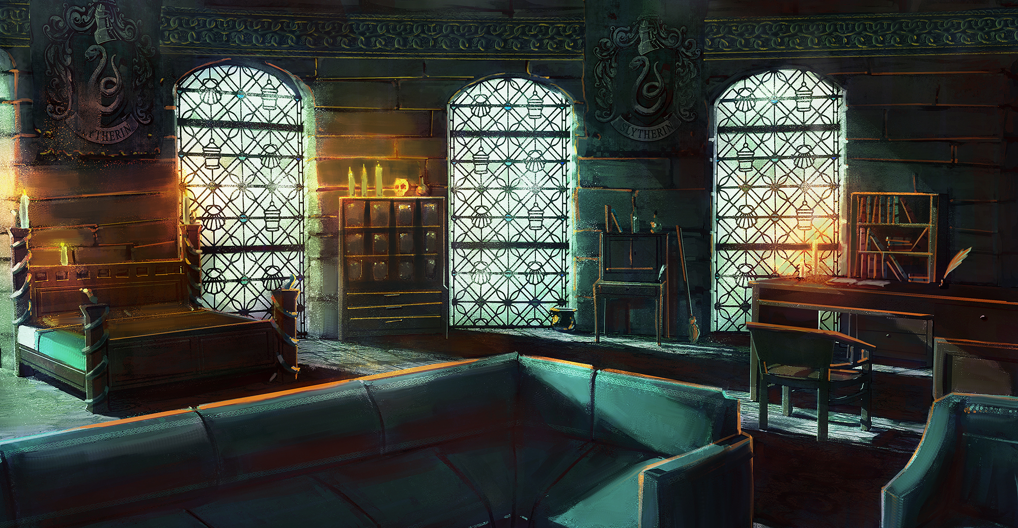 The Slytherin Common Room Is Partly Under The Lake Which Gives A Greenish Blue Tinge To Part Of The Common Area Slytherin House Slytherin Harry Potter Bedroom