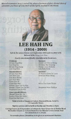 Rest In Peace Mr Lee Hah Ing 1914 2009 Family Obituary Printed In Straits Times